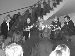 "Ausdruck und Alltag"Mit "Künstler meet Galeristen, Sammler, Kritiker" starteten die Organisatoren von AuA (Ausdruck und Alltag) ihren 2. Versuch, an die Tradition der Kultursalons des 19. Jahrhunderts anzuknüpfen. Sprachlich angehippt nennt sich solches heute "Informelles ComeTogether" und diesmal lud man ins Volkstheater in der Briennerstrasse um zu klären Wer und Was Kunst erfolgreich macht. Von den, im Veranstaltungstitel angekündigten Sammlern liess sich zumindest auf dem Podium keine/r blicken und so musste sich der nur leidlich vorbereitete Moderator Armin Kratzert (Bayerischer Rundfunk) mit dem Versuch begnügen den verbliebenen Vertretern der Kunstszene mehr, als nur die üblichen, leeren Sprechblasen zu entlocken. Zunächst einigte man sich darauf dass es einfach zu viele Künstler gäbe, was Olaf Metzler (Künstler und AkademieProfessor) die Gelegenheit bot sein sattsam bekanntes Bonmot "Es braucht viele, damit wenige gut werden können" zum Besten zu geben.
