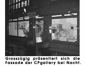 | ![]() Christa Probsts eigene Arbeiten sind expressiv abstrakt gehalten, wobei sie auch gerne chinesische Kalligraphie in ihre Bildkompositionen einarbeitet. Das Repertoir der anderen Künstler reicht von abstrakter und figurativer Malerei bis hin zur Fotografie oder Skulptur. Die Galerie wurde Anfang 2000 mit Werken des Fotografen Josef Schmitt eröffnet und der Nürnberger Maler Klaus Neuper zeigte in der zweiten Ausstellung des Jahres seine, meist grossformatigen, informellen Bilder. Mit schwarz, weiss, warmen Erdtönen und reduzierter Formensprache erzeugt er ruhige konzentrierte Stimmungen. Weitere KünstlerInnen der Galerie sind Gerhard Winter, Lin Yizheng, Schwarzenbach, Alekxey Sabido, F. David Caicedo Castro, Andres Bélmar und Carmen Grau näheres kann man unter www.cpgallery.com erfahren. |