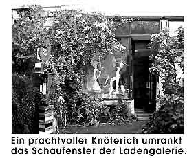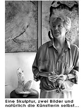 Die an den Galerieraum angeschlossenen Atelierräume boten Einblicke in das kreative Schaffen. Da die Künstlerin neuerdings ihren Schwerpunkt auf die Malerei verlegt hat, war dies auch Anlass zur Präsentation ihrer neuesten Arbeiten, einer Reihe von reliefartig strukturierten und mit feinen Konturen durchzogenen Bildern. Am zweiten Öffnungstag erlaubte es das Wetter sogar, sich mit der vielseitigen Künstlerin vor ihrer Ladengalerie zu einem Gespräch zusammenzusetzen. Wer an den beiden Tagen keine Zeit hatte, kann seinen Besuch zu den normalen Öffnungszeiten (siehe News) nachholen. © universal arts - Verwendung nur im Rahmen unseres Lizenzmodells Photos: universal arts | "Kreative Welten"München 14. 7. 1999 Mit dornröschenhafter Romantik macht ein Vorgarten in der Orffstrasse neugierig. Rechts daneben trifft man auf einen knöterichumrankten Laden mit einem großen Schaufenster, hier locken bizarre Skulpturen, halb Ziege halb Mensch, zum eintreten in kreative Welten. Die Rede ist von Hanna Sperl-Flüggens Galerie Atelier. Tritt man über die Ladenschwelle, ist man bereits von Kunst umringt. In dem kleinen Galerieraum, der jedoch durch seine Altbauhöhe besticht, sind in Regalen auf verschiedenen Ebenen Skulpturen aus allen Schaffensperioden der Künstlerin zu sehen, ihre informellen Bilder an den Wänden machen die Komposition perfekt. Dies ist jedoch nicht alles, was Hanna Sperl-Flüggen zu bieten hat. An zwei aufeinander folgenden Tagen lud sie ins offene Atelier ein. ![]() |