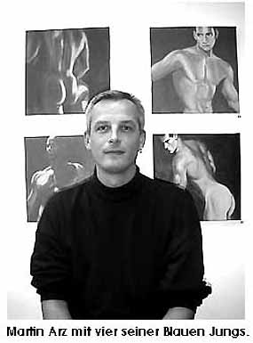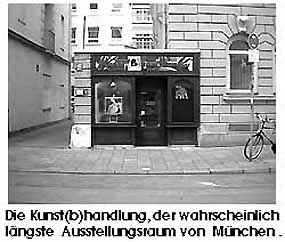 "Intermezzo"München den 12. 10. 1999 Fast wie ein Schwalbennest schmiegt sich die Kunst(B)handlung an einen der neoklassizistischen Bauten in der Müllerstrasse. Tritt man durch die hölzerne Ladentüre, so findet man sich in einem schmalen, aber überraschend langen Ausstellungsraum wieder. Durch zwei Dachfenster fällt Tageslicht das nach Einbruch der Dämmerung durch kräftige Deckenfluter ersetzt wird, die Einrichtung ist schlicht und stilvoll, man befindet sich bei "Designbewussten", was schon am aktuellen G3 Mac zu erkennen ist. Die Galerie besteht seit 1996 und hat den Schwerpunkt ihres Programmes auf männerrelevante Themen gelegt. Der Münchner Maler und Autor Martin Arz gehört zum festen Stamm von Künstlern, die hier regelmässig ausstellen. Diesmal bat er zu einem kurzen Intermezzo.