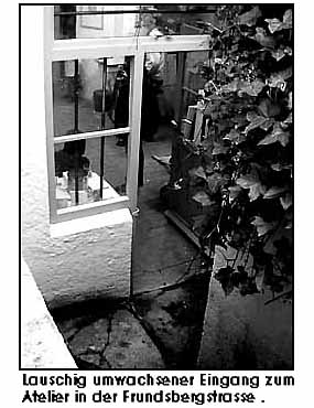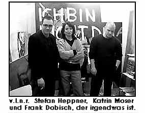 Neben Bekanntem, wie den, meist in Sand- oder Erdtönen gehaltenen, filigran strukturierten Bildern von Heppner, oder den reliefartigen Wachsfiguren von Moser gab es auch Neues zu sehen. Dobisch zeigte ein grossformatiges Schriftbild, sowie die ersten vier Exemplare einer Serie von merkwürdigen Gesichtern in einer Art Wachstuchtechnik und Frau Moser gelang mit grossflächigen, comicartigen Collagen eine Verbindung zwischen ihren Parafinarbeiten und den, nur auf den ersten Blick niedlichen, kleinen Tuschezeichnungen. Wer den Termin verpasst hat und nicht auf die nächste Atelieröffnung warten will kann sich einstweilen auf der Website der Künstler, www.european-art-work.de* ein Bild machen. (*Anm. der Red. - Website existiert nicht mehr) Mehr zu Frank Dobisch siehe auch... © universal arts - Verwendung nur im Rahmen unseres Lizenzmodells Photos: universal arts | "to be continued..."München den 15. 5. 1999 Wonnemonat Mai, nach zwei Jahren Abstinenz von der heimatlichen Live-szene melden sich Katrin Moser, Frank Dobisch und Stefan Heppner zurück und öffnen ihr, im vorigen Jahr frisch bezogenes, stilecht im Souterrain (Neuhauser Altbau) gelegenes Atelier einen Tag lang der Öffentlichkeit. ![]() |