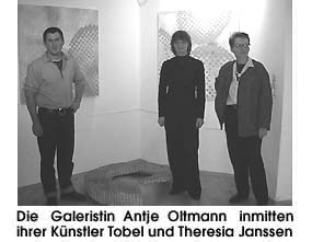 Diesmal präsentierte sie in einer Doppelausstellung Malerei und Skulptur gemeinsam. Zum Einen Theresia Janssen, eine Bremer Künstlerin, die ihre Bilder in einer sehr individuellen Mischtechnik fertigt und Fragmente aus der Drucktechnik ins malerische überträgt, um sie dann durch eine Art Holzschnittechnik ins Trägermaterial hinein zu erweitern. Zum Anderen Tobel, einen jungen Bildhauer aus München, der rohe Steinblöcke gerne spiralförmig durchhöhlt und einige seiner Arbeiten deshalb "Durchgedreht" benennt. Beiden gemeinsam, und deshalb wohl das verbindende Element in dieser Ausstellung, ist der Platz, den die Künstler dem Hohlraum in ihren Werken einräumen. Mit etwas Glück wird die Galerie auch bald über eine WebPräsenz verfügen, wir sind gespannt was wir dann unter www.galerie-oltmann.de vorfinden werden. | "Farbe, Holz und Stein"München 23. 11. 2000 Es muss nicht immer Maximilianstrasse oder Gärtnerplatzviertel sein. Neben Haidhausen, Schwabing und Neuhausen wirbt jetzt auch Sendling vermehrt um die Gunst des kunstinteressierten Citoyen. In der Kapuzinerstrasse, ein wenig im Schatten eines Möbelcenters, ist seit nunmehr anderthalb Jahren die Galerie von Antje Oltmann beheimatet. Für einen festen Künstlerstamm, so meint sie, ist es noch zu früh und so wählt sie frei nach ihrem Geschmack, nur gebunden an ihre Vorstellung eines erweiterten Kunstbegriffes, aus der Fülle der Angebote aus. ![]() © universal arts - Verwendung nur im Rahmen unseres Lizenzmodells Photos: universal arts |