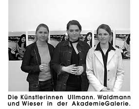 "Kunst im Untergrund" | ![]() Diesmal sind es drei Studentinnen C.Wieser, S.Ullmann und W.Waldmann, die sich hier für den ganzen April die Wände erobern konnten. Sie zeigen ein gemeinsam entwickeltes Konzept mit Malerei und Fotografie in Kombination, wobei beide Genres von allen drei Künstlerinnen abwechselnd ausgeführt wurden. Bei dieser Gemeischaftsarbeit ist einen Urlaubsfoto das Grundmotiv das als Vorlage für die Malerei benutzt wurde. Die malerische Umsetzung wiederum diente als weitere Fotovorlage, nach diesem Prizip reproduzieren und weitergeben und das reihum entstanden im Zeitraum eines halben Jahres 60 Bilder und Fotografien. Das Ziel war es mit der ständigen Wiederholung des gleichen Motives durch drei unterschiedliche Personen und deren malerische Herangehensweise eine Metamorphose oder zumindest eine Entfernung vom Original zu erzeugen. Ob dieser Effekt den drei Künstlerinnen gelungen ist, davon sollte man sich am besten vor Ort überzeugen, zumal sie auch während der Ausstellungsdauer dort anwesendend sein werden und Fragen der Besucher beantworten können. © universal arts - Verwendung nur im Rahmen unseres Lizenzmodells Photos: universal arts |