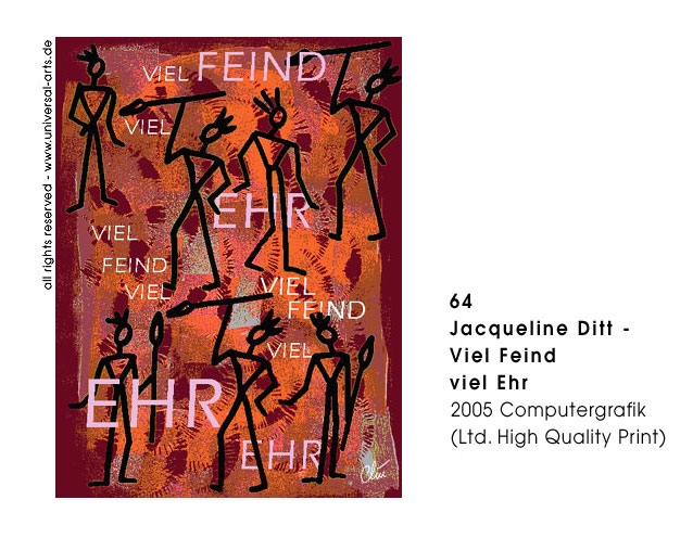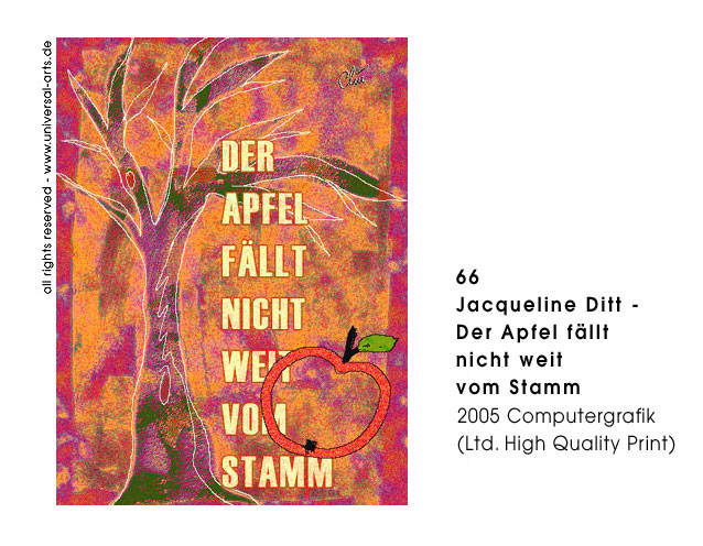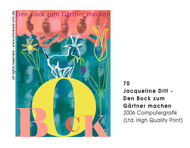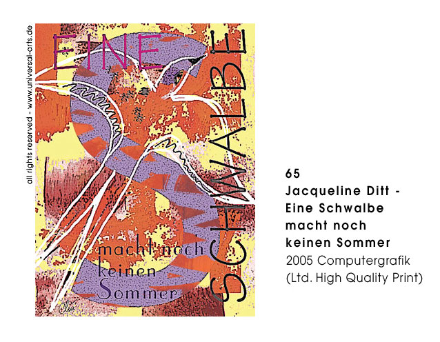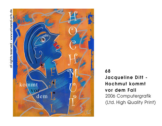 Die künstlerische Umsetzung bekannter Sinnsprüche, ist die Intention der Ausstellung "TypoGraphics". Jacqueline Ditt spielt mit Typografie und piktogrammartigen Zeichnungen in Kombination mit malerischen Hintergründen, um die Bedeutung jedes einzelnen Spruches herauszuarbeiten. Dies gelingt ihr ohne, bei allem Ernst der Materie, den Humor zu vernachlässigen. Die Malerin tauscht hier erneut den Pinsel mit dem digitalen Zeichenstift und nutzt das Spannungsfeld zwischen Malerei und Grafik.