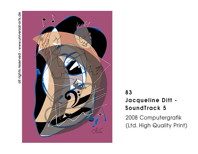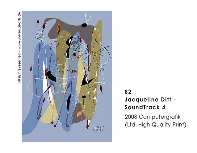 Die Computergrafik-Ausstellung "SoundTrack" ist, wie der Titel schon vermuten lässt, der Musik gewidmet. Jacqueline Ditt hat hier ein Wortspiel auf dem Papier umgesetzt, im dem sie die "Tracks bzw. Spuren", die die Musik im Raum hinterlässt in Linien, Flächen und Figuren andeutet. Gleichzeitig hat jeder der Buchstaben, die das Wort Soundtrack ergeben jeweils eine eigenständige und individuelle Komposition. Zusammen ergeben die 10 Werke jedoch ein Gesamtbild. So kann man den "Groove" der Ausstellung ablesen.