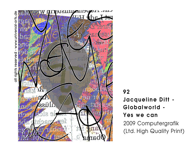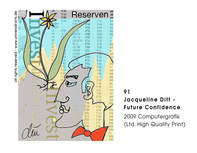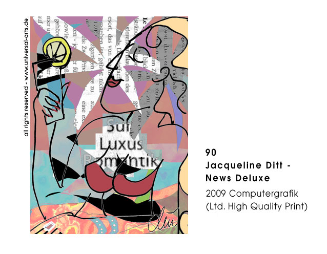 Täglich laufen unzählige Nachrichten aus aller Welt über die Newsticker. Bei dieser Informationsflut stellt sich oft die Frage was sind hier eigentlich die "Good News ?" Dieses Thema behandelt Jacqueline Ditt in ihrer aktuellen Computergrafik Ausstellung. Mit digitalem Zeichenstift und "echten" News aus Zeitungsberichten collagiert die Künstlerin am Computer. Sie benutzt die einströmenden Nachrichten und kreiert für uns damit die gefilterte "schöne heile Welt". Hierbei arbeitet sie mit Zeitungsrastern, Pixelstrukturen und verschiedenen überlagerten Bildschärfebereichen, diese unterstreichen die flüchtige Erscheinung der Informationen in Printmedien und auf dem Bildschirm.