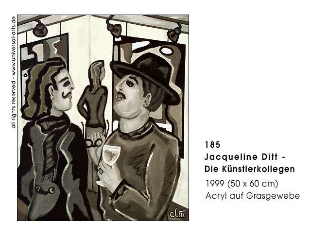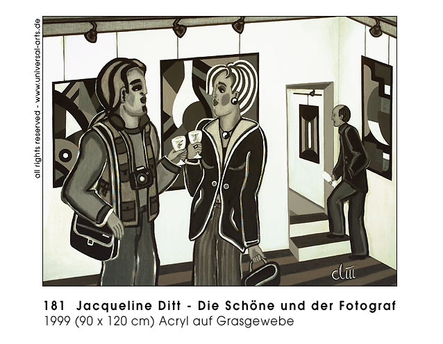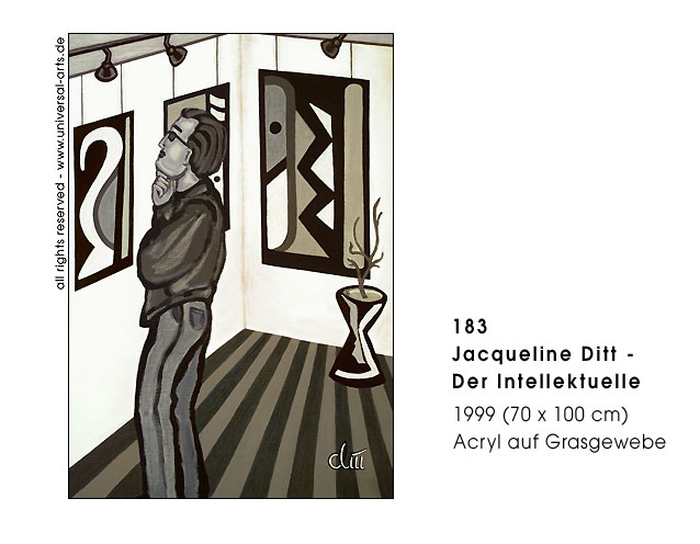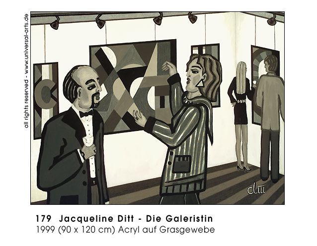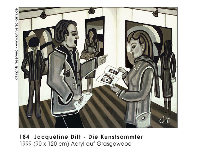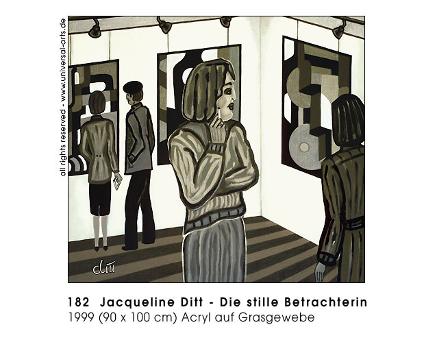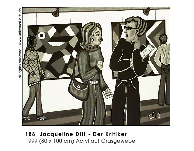 Die Aussstellung hat sowohl dokumentarischen als auch amüsanten Charakter, denn in einer Bildergeschichte werden die "Besucher einer Ausstellung" aufs Korn genommen. Aus der sicheren und anonymen Betrachterrolle herausgeholt, findet sich der Kunstfreund unter Umständen auf den Gemälden wieder. - Ausstellung 1999 - "Schwarz-Weiss" - 12 Gemälde von Jacqueline Ditt.