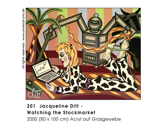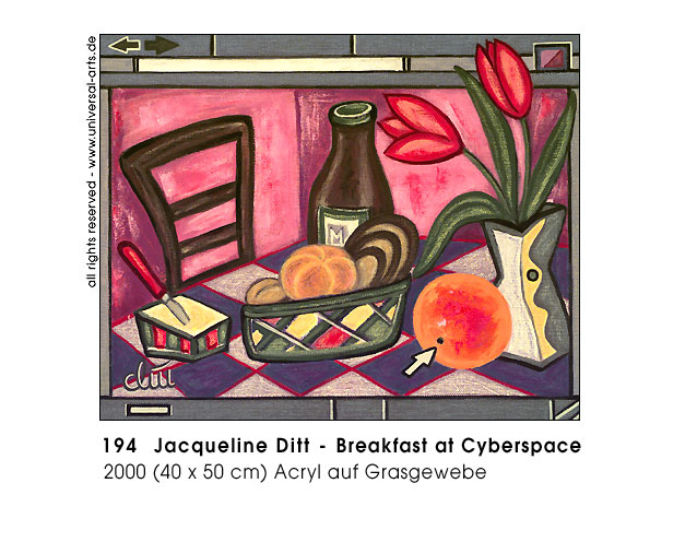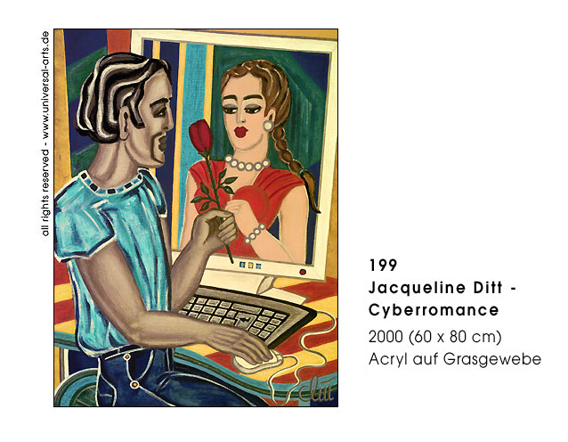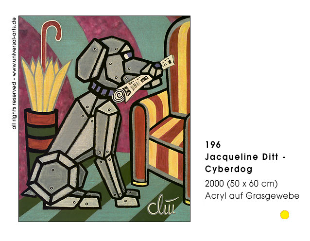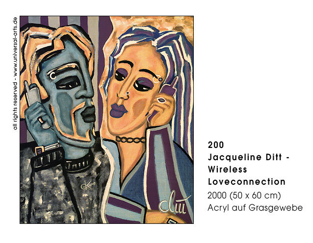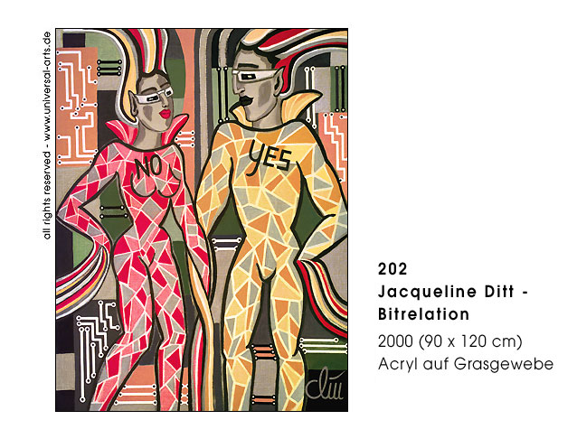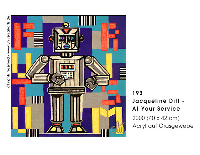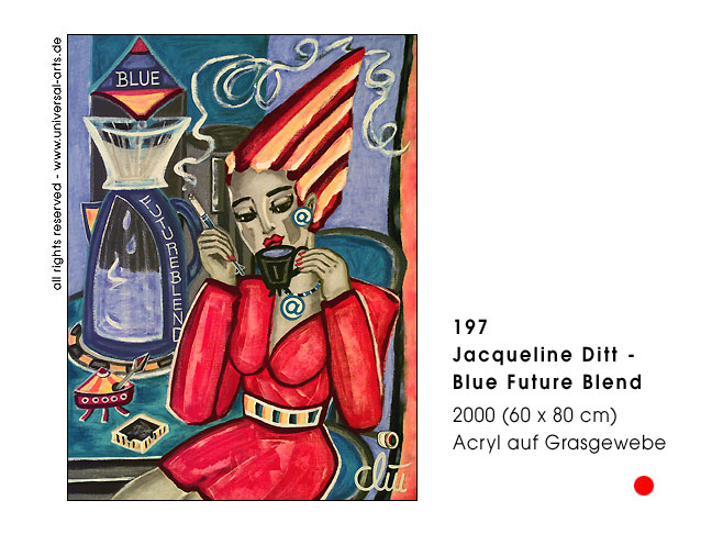 Am Ende des Jahres 2000, sozusagen am Nullpunkt des nächsten Jahrtausends, stellt sich die Frage "wird sich nun alles verändern oder bleibt es beim Alten?" Nun letzteres mit Sicherheit nicht, denn viele sind schon dem Futurismus verfallen. Die Vision des omnipotenten Computers beziehungsweise Roboters, der dem Menschen das Leben erleichtert ist schon spurenweise in die Tat umgesetzt.... - Ausstellung 2000 - "Futurism" - 10 Gemälde von Jacqueline Ditt.