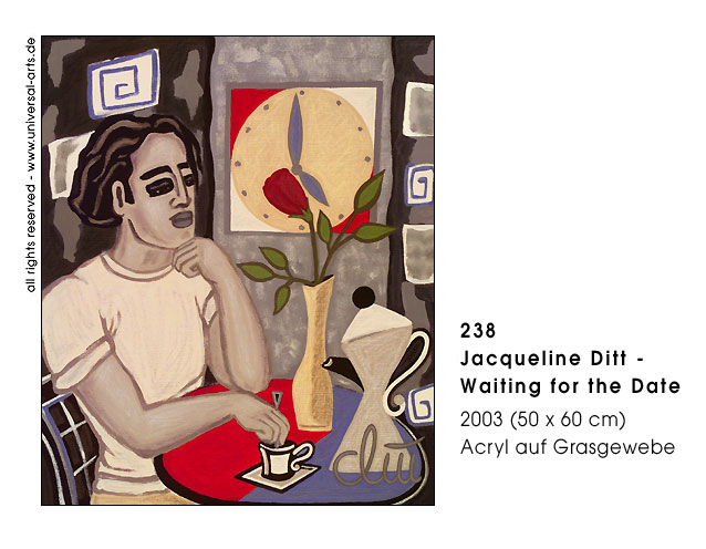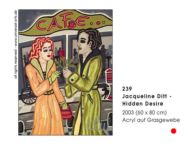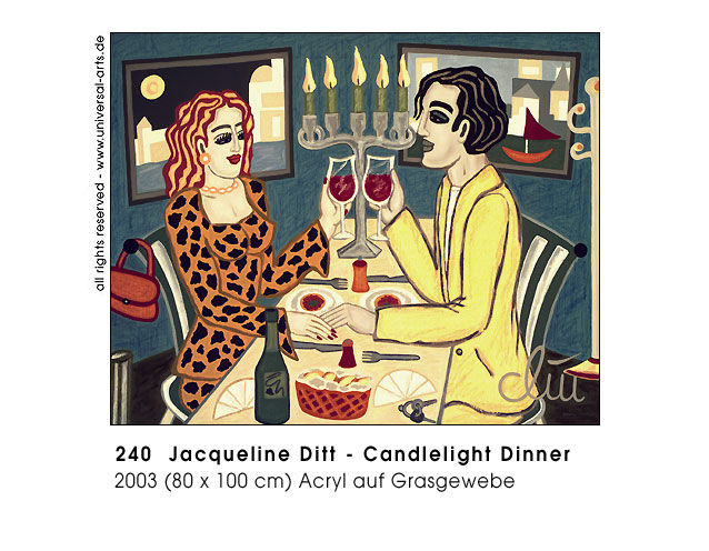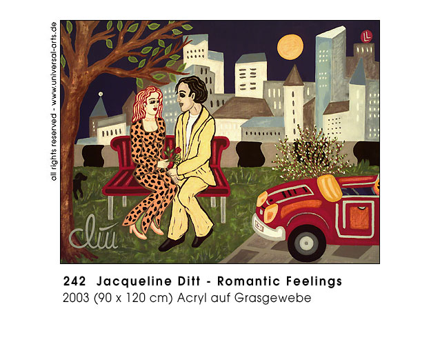 The exhibition "LoveLesson" of Jacqueline Ditt gives an operating instruction to the viewer for the careful approximation of the sexes. One of the possibilities is shown in a picturestory of eight expressionistic paintings. Whether for a one night stand or a longer relationship, the proceeding is always the same, so this flirtguide could be useful for persons wich won't remember this. - Exhibition 2003 - "Love Lesson" - 8 paintings by Jacqueline Ditt.