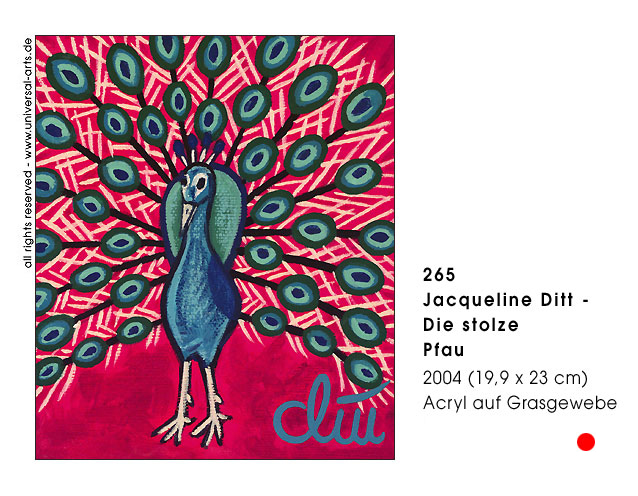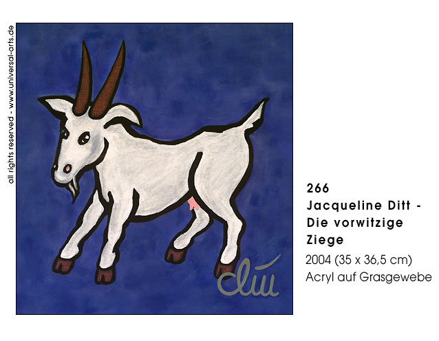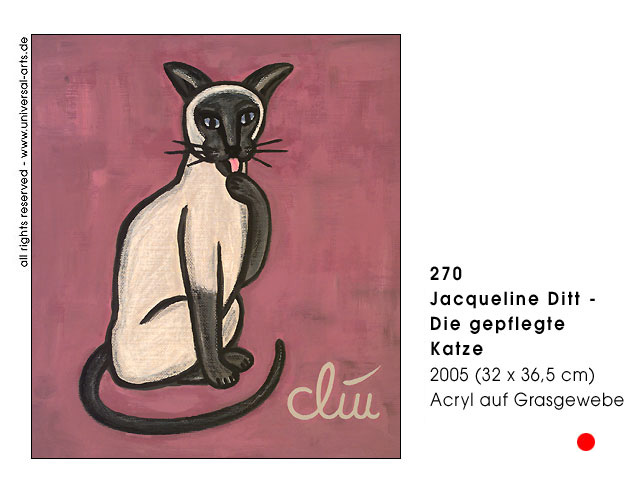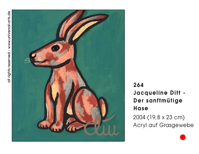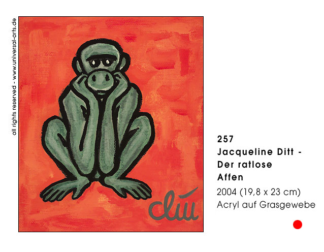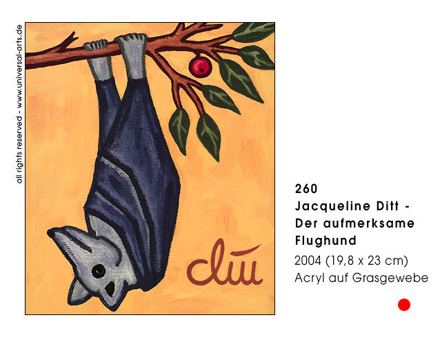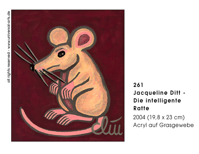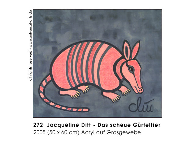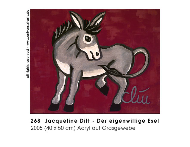 Der Mensch reflektiert sich und ordnet den einzelnen Tieren aufgrund ihrer Optik oder des vermeintlich erkennbaren Wesens menschliche Charaktereigenschaften zu. Dabei stellt sich die Frage ob es sich hierbei nur um Anthropomorphismus oder eine tatsächliche Ähnlichkeit zwischen Mensch und Tier handelt. Die Malerin hat sich von sprichwörtlichen Redewendungen inspirieren lassen aber auch eigene "Wesensdeutungen" vorgenommen. - Exhibition 2005 - "Animal Show" - 23 Gemälde von Jacqueline Ditt.