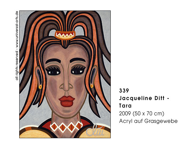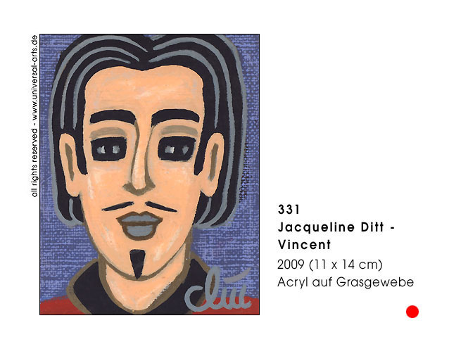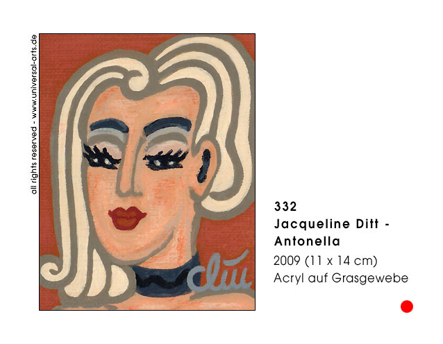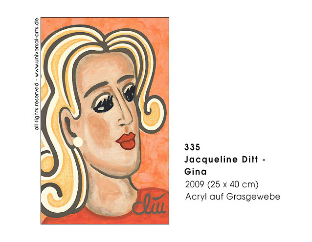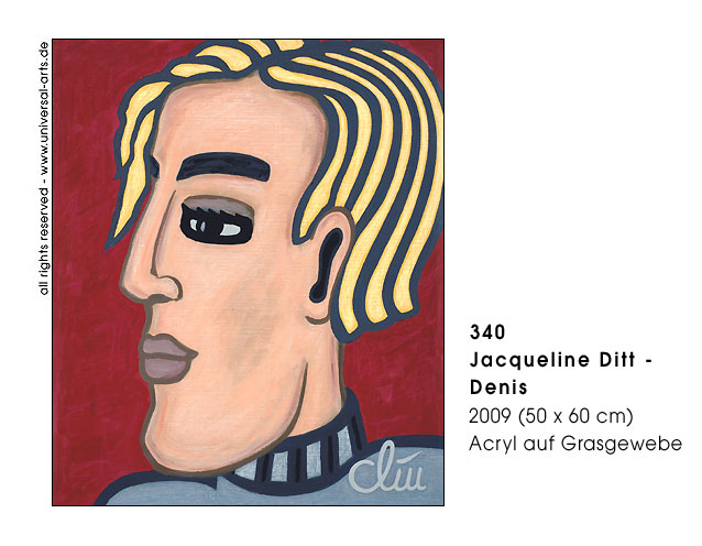 A series of portraits, spiced with some humor, shows the different results of "face design" while useing similar components. But the cardinal question is, how do we get our personality, - there might be a coherence to the spirit of the age or influence of thoughts and the environment of our growing up or even the choice of our name might be responsible. Surely it is a matter of time and progressive developement that engraves our unique personal character on our faces. - Exhibition 2009 - "Personality" - 18 paintigs by Jacqueline Ditt.