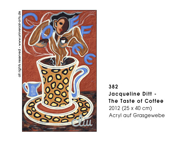 Heute bedeutet Koffein Kapsel-Kaffee oder "Coffe To Go" im Plastikbecher, auch stylische Kaffeemaschinen sind absolut "kultig". Geschwindigkeit ist das Zeichen der Zeit und dieser "legale Stoff" ist die Nummer eins für einen perfekten, raschen Tages- und Arbeitsablauf. Aber der Konsum hat eine lange Tradition, in vielen Kulturen kennt man die Benutzung schon von alters her und Koffein ist auch Inhaltsstoff von verschiedenen anderen Pflanzen, zum Beispiel schwarzem und grünem Tee. Kaffeehäuser waren Plätze um Konversation zu pflegen und die Teezeit oft eine Zeremonie. Natürlich ist die Frage "Kaffee oder Tee" auch Geschmackssache aber ungeachtet dessen was die Leute bevorzugen so ist es wohl kein Genuss das Getränk, wie heute in Hast zu konsumieren. - Ausstellung 2012 - "Coffein" 12 Gemälde von Jacqueline Ditt.