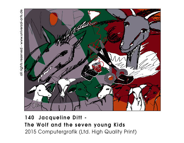 Die Ausstellung "Fairy Tales - Reloaded" ist dafür gedacht die Erinnerung aufzufrischen, Jacqueline Ditt zeigt neun Werke in gewohntem Stil, expressiv, surreal bisweilen auch mit Pop Art Elementen. Die Künstlerin gibt zu bedenken, dass es kritisch sein kann gerade die Gehirne von Kindern mit unterschwelligen Vorurteilen zu füttern. Zum Beispiel, junge Mädchen müssen hübsch, gutgläubig, gehorsam und unschuldig sein, ausserdem immer nach einem wohlhabenden Prinzen Ausschau halten. Andererseits sind ältere Frauen unansehnlich, Stiefmütter bevorzugt neidisch, eifersüchtig, gemein und auch hinterlistig. Während junge Männer gut aussehende Prinzen sind oder zumindest enorm gerissen um jede gefährliche Aufgabe zu bewältigen, häufig sind sie reich, oft sogar Könige, wenn sie älter sind, oder Helden und tapfere Ritter. All dieser "Märchen Stoff" ist zweifelsohne unterhaltsam, manchmal sogar lehrreich, deshalb will die Künstlerin sie auch substanziell nicht ändern aber sie sind was sie sind, sehr populäre "Alte Geschichten" und in Bezug auf tradierte Rollenklischees sollten wir uns doch eher in Richtung Emanzipation bewegen. - Ausstellung 2015 - "Fairy Tales - Reloaded" - 7 Gemälde und 2 Grafiken von Jacqueline Ditt