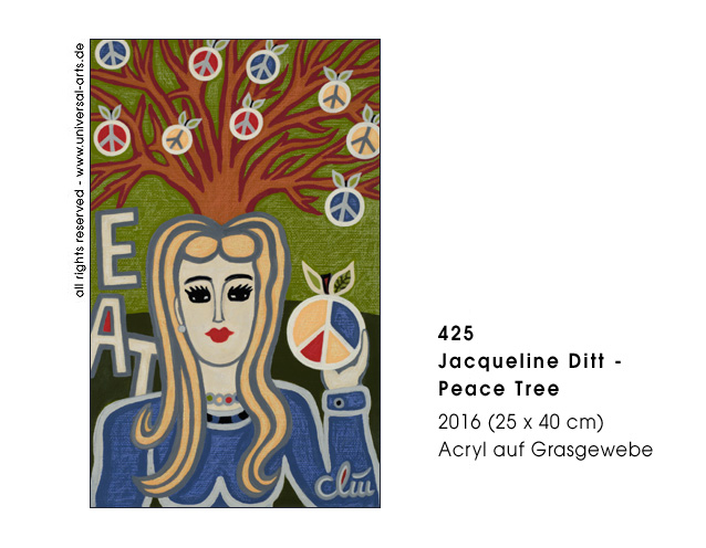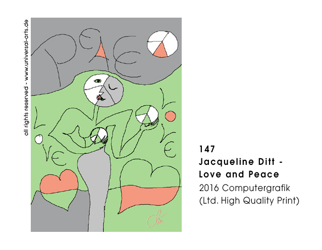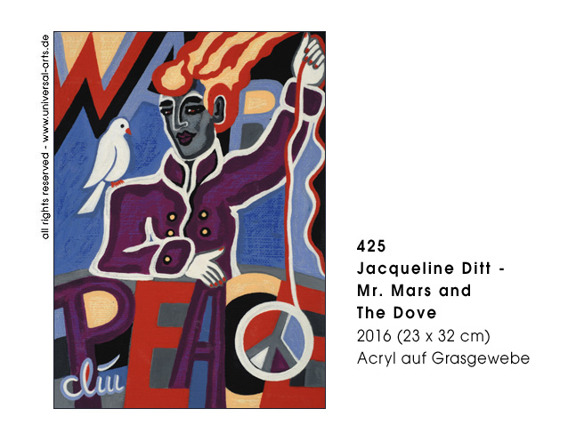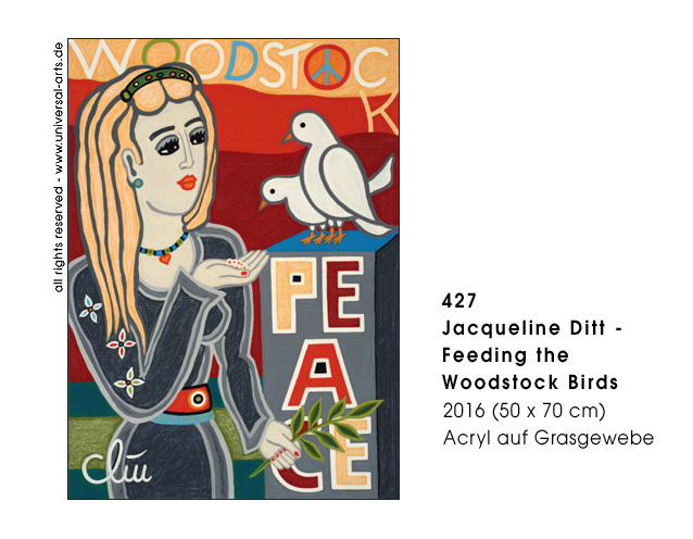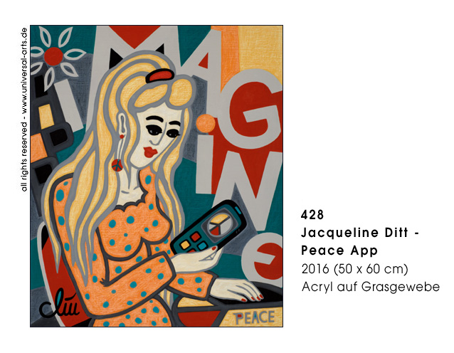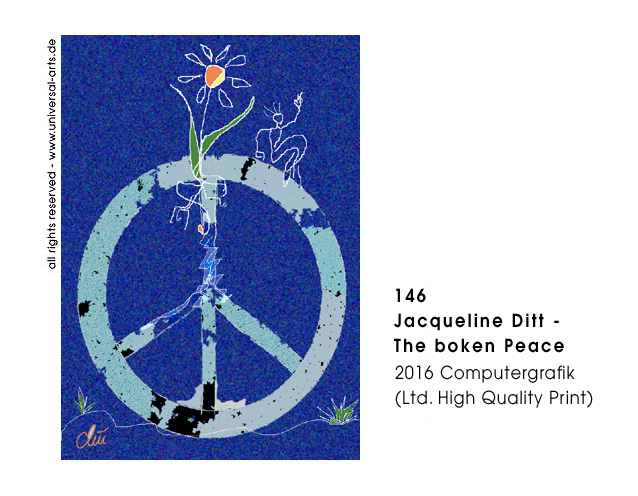 Frieden ist zur zeitnicht "En Vogue", gut ist böse und böse ist großartig, also wäre es nötig, das Rad in eine andere Richtung zu drehen. Es könnte zwar ein unrealistischer Traum sein, die Leute zu stoppen hasserfüllt zu denken und auch Kunst ist nicht in der Lage die Welt zu verändern, aber sie kann die Botschaft von Liebe und Frieden aussenden. So sollten die Menschen diese überdenken und es wagen einen großen Schritt in eine friedliche Zukunft zu machen. Es ist an der Zeit, ein paar Friedenszeichen auszusenden, dies tut die Malerin in ihrer Ausstellung 2016 - "Peace People and other" 8 Gemälde and 2 Grafiken von Jacqueline Ditt