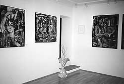 Photos: universal arts Pressestimmen zur Ausstellung: The Dance Der Künstler Mario Strack beschäftigt sich mit der Produktion von Illustrierter Musik. Das Gesamtkunstwerk aus Rockmusik, Lyrik, Computergraphik und digitalen Videobildern ist ein äusserst sinnliches Erlebniss. Parallel zu Stracks Musikvideo "The Dance" im Studio sind Gemälde von Jacqueline Ditt in der Galerie zu bewundern... Prinz Sehen und Höhren ...den Mittelpunkt der Ausstellung bildet das Diptychon "Geben" und "Nehmen", das die von unserer Sozialgemeinschaft geforderte weibliche und männliche Position darstellt... Kunst Aktuell Begehrlichkeiten ...wer neugierig ist auf Kunst, die Augen und Ohren anspricht, mag sich im Studio das Musikvideo "The Dance" ansehen. Bilder wirken wie Begleitinstrumente der selbstkomponierten Rockmusik, entsprechen also nicht der Videoclip-Ästhetik der schnellen Schnitte und realistischen Darstellung... Applaus - Münchner Kulturmagazin universal arts ...Die Gemälde der Künstlerin beschreiben auf kritische und ironische Weise gesellschaftliche Klischees: Sie stehen direkt oder indirekt symbolisch für einen erstrebenswerten Lebenszustand und sollen den Betrachter zum Nachdenken über seine Position und seine "Begehrlichkeiten" anregen. Ditt bezeichnet ihre Stilrichtung als "Neuer Expressionismus - die Kunst des seelischen Ausdrucks im zeitlichen Kontext"... Münchner ![]() "zurück zum Photoalbum..." |
