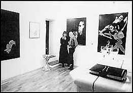 Abb. links: Frank Dobisch im Gespräch mit Herrn P. (Wer ist der Künstler ?) Abb. rechts: Katrin M. und Yvonne P., umringt nur von echten Dobischen. Photos: Bethel... Pressestimmen zur Ausstellung: Frank Dobisch Der 25 jährige Künstler ist schon viel in der Welt herumgekommen. In seinen Bildern spiegeln sich vor allem südamerikanische Einflüsse und Inspirationen. Neben dem Zyklus "Fünf Bilder" wird der Videofilm "der Freudenheld" gezeigt, der die Realisierung des gleichnamigen Bildes dokumentiert. Prinz Ein Bild, das nicht von der Wand fällt ...wärend er vor drei Jahren eher konzeptionell arbeitete und zu Druck und Abstraktion tendierte, widmet sich Dobisch jetzt verstärkt der figurativen Malerei...Bei den fünf Werken gibt es keine vorgegebene Thematik, jedes kann für sich alleine stehen... Applaus - Münchner Kulturmagazin Licht und Schatten ...Der experimentierfreudige, erst 25 jährige Künstler, der sich immer wieder neuen Motiven zuwendet, schafft es, mit eigenen Texten, Fotografien und Skulpturen Brücken zwischen verschiedenen Kunstgattungen zu schlagen. Seine aktuellen Arbeiten widmen sich der figurativen Darstellung... Kunst Aktuell ![]() "zurück zum Photoalbum..." |