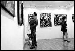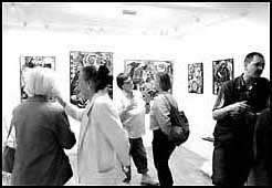 Abb. links: Rege Diskussionen in allen Ecken (wohl über Kunst ??) Abb. rechts: Andreas L. bei genauer Bildbetrachtung, im Hintergrund eine Unbekannte. Photos: Gogo Eisert Pressestimme zur Ausstellung: Get the Groove Die Produzentengalerie universal arts zeigt vom 20. 7. bis 9. 8. die Ausstellung "Alles neu ´96", die auf dem Dialog zweier künstlerischer Erfahrungswelten beruht. Wärend Mario Strack seine Musikkompositionen auf der Videoebene in Bewegte Graphiken oder Realfilm umsetzt, lässt Jacqueline Ditt ihre Gemäldekompositionen im Geiste des Betrachters erklingen. In 12 Werken führt sie ihn auf die Reise in die eigentlich nicht fassbare immaterielle Ebene der Musikempfindung. Die Bilder zeigen daher nur "Momentaufnahmen" der einzelnen Komponenten einer Musikkomposition. Mario Strack führt in einem Film J. Ditts Gemälde "Get the Groove" mit dem gleichnamigen Song zu einer audiovisuellen Einheit zusammen. Kunst Aktuell ![]() "zurück zum Photoalbum..." |