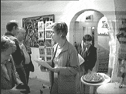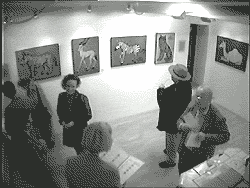 Benutzen Sie das Link um eine original Klangkulisse der Vernissage abzuspielen. München 8.10.2005 Der diesjährige Goldene Oktober brachte nicht nur bestes Wetter, sondern auch die Kunstfreunde zur Vernissage von "Edition 05" mit. Diesmal widmete sich die Malerin Jacqueline Ditt ausschliesslich dem Tier und dessen vermeintlich menschlichen Eigenschaften. Bei der stattlichen Anzahl von 23 Gemälden die unter dem Titel "Animal Show" gezeigt wurden blieb für den Besucher kaum ein Wunsch zur persönlichen Identifikation mit dem Lieblingstier offen. Der Gedanke, dass der Mensch "womöglich" auch vom Tier abstammen könnte blieb dabei nicht ganz ausgeschlossen. Das Thema animierte übrigens auch zwei Vierbeiner aus der Umgebung zum Besuch der Ausstellung. Mario Strack zog im Studio das Publikum mit seinem neuen Song "Generator" (anhören) in den Bann. In dem dazugehörigen , ausschliesslich am Computer generierten Videoclip zeichnet der Künstler sowohl auf dem Screen als auch musikalisch eine völlig vituelle Welt, bis hin zur Cyberreligion. Seine Ikonen im artifiziellen Raum bewegen sich rhytmisch zur Musik und lösen sich bisweilen in völlige Abstraktion auf. Dies zog den Betrachter hypnotisch hinein in die Virtualität und er konnte für kurze Zeit seiner "eigenen Realität" entfliehen. Unternehmen Sie einen "virtuellen Rundgang" durch die Ausstellung. Photos: universal arts Web-blogs zur Ausstellung: Ausstellung Animal Show 8. Oktober 2005 universal arts Die Ausstellung “Animal Show” zeigt grosse und kleine Tiere. Sie versinnbildlichen menschliche Charakterzüge, Thema ist, das Tier im Menschen beziehungsweise umgekehrt. Der Mensch reflektiert sich und ordnet den einzelnen Tieren aufgrund ihrer Optik oder des vermeintlich erkennbaren Wesens menschliche Charaktereigenschaften zu. Dabei stellt sich die Frage ob es sich hierbei nur um Anthropomorphismus oder eine tatsächliche Ähnlichkeit zwischen Mensch und Tier handelt. Jacqueline Ditt hat sich von sprichwörtlichen Redewendungen inspirieren lassen aber auch eigene “Wesensdeutungen” vorgenommen. In dem Videoclip “Generator“ zeichnet Mario Strack das Bild einer artifiziellen, mit Computerprogrammen kreierten Welt. Nicht eine realistische Simulation der Physischen Wirklichkeit sondern extreme graphische Reduktion bis hin zur völligen Abstraktion erzeugen hier die Ikonen einer “Cyber-Religion“. Auch das, an sich lyrische Songkonzept, wird vorwiegend mit typischen, synthetischen Klängen aufgebaut. Der “Heilige Geist“ mutiert zum Silikongehirn. Kulturserver - Bayern ![]() "zurück zum Photoalbum..." |
